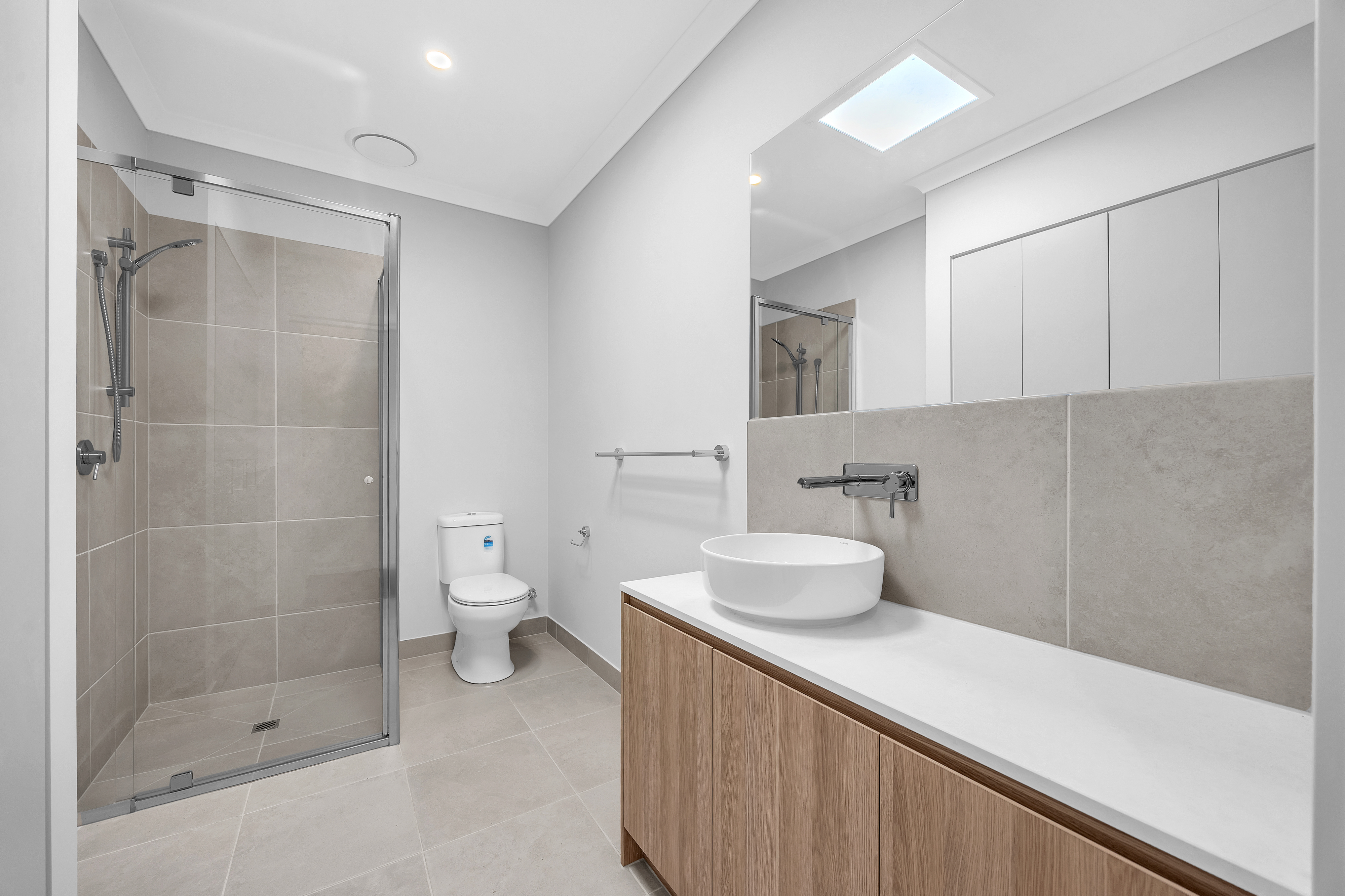 – Central bathroom with vanity, shower, bath, toilet, and additional storage