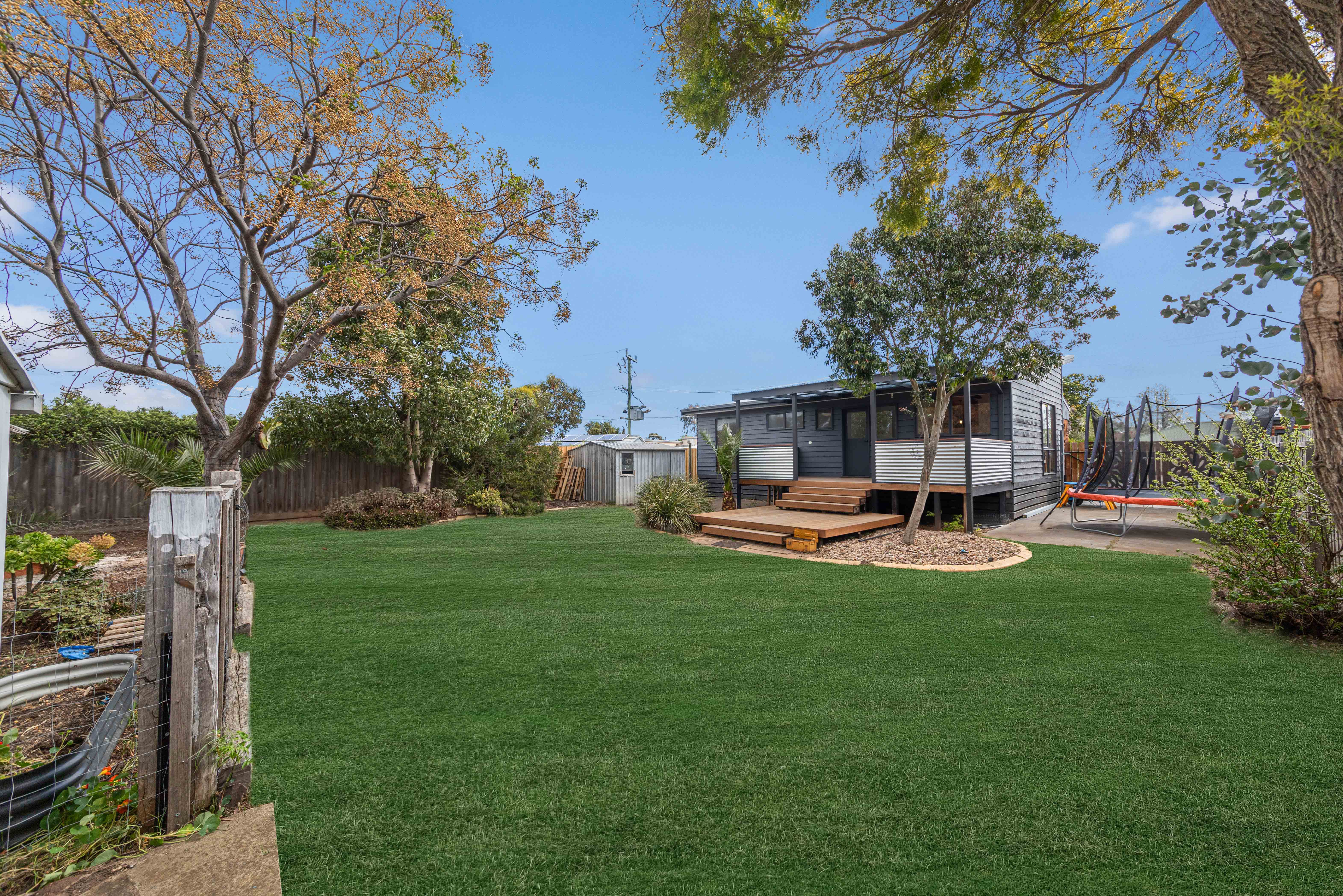 – Large, fully fenced backyard with chicken coops, storage shed, and garden beds